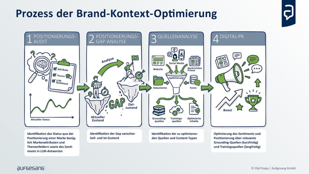 Das Konzept der Brand-Kontext-Optimierung wurde von uns aufgrund des tiefen technologischen Verständnisses darüber wie Sprachmodelle (LLMs) Marken erkennen, verstehen und einordnen entwickelt. Daraus haben wir einen vierstufigen Optimierungsprozess entwickelt.